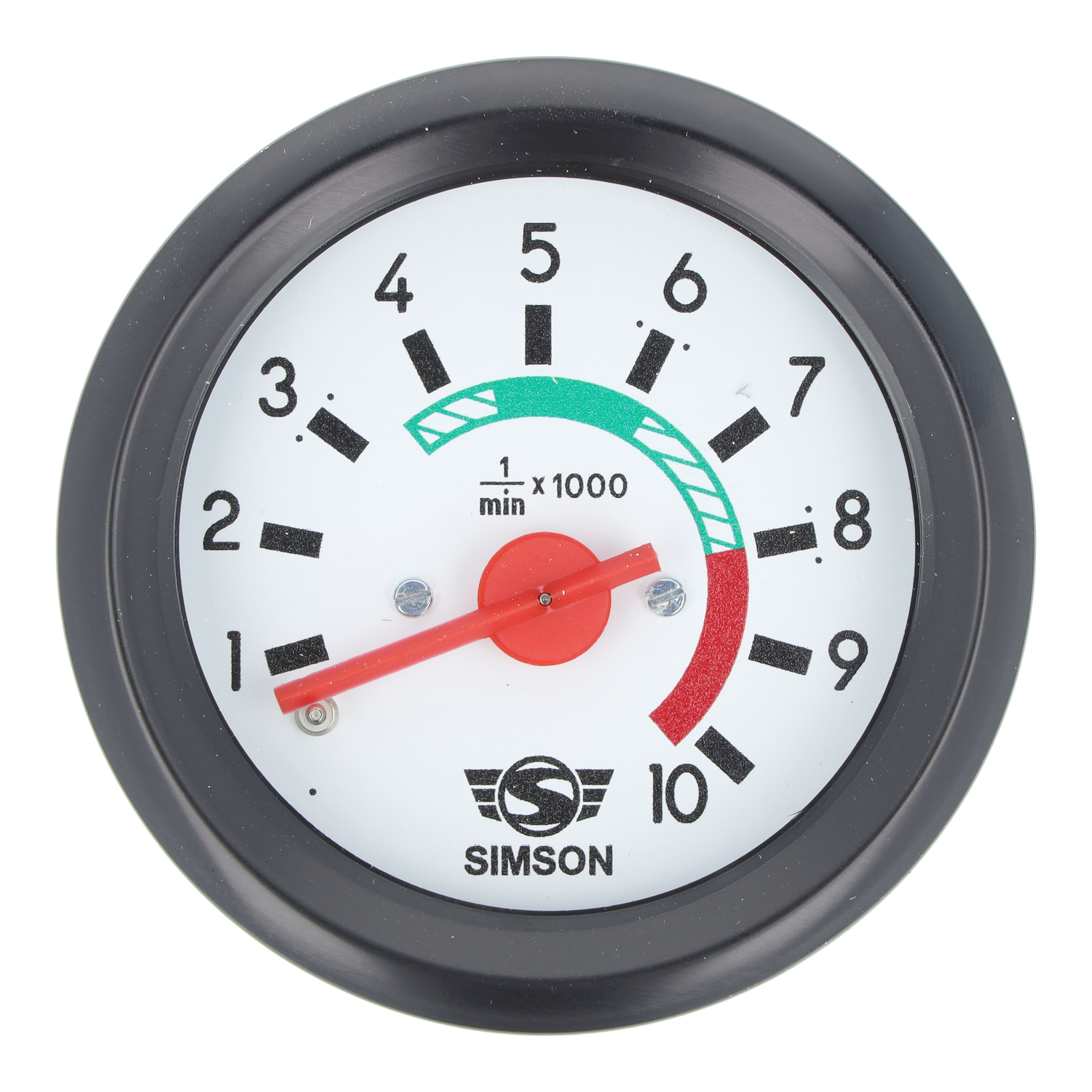 Ohne Kontrollleuchte für Fernlicht. Tachoring schwarz. Zeiger Rot. Ziffernblatt weiß mit Simson-Logo unten.