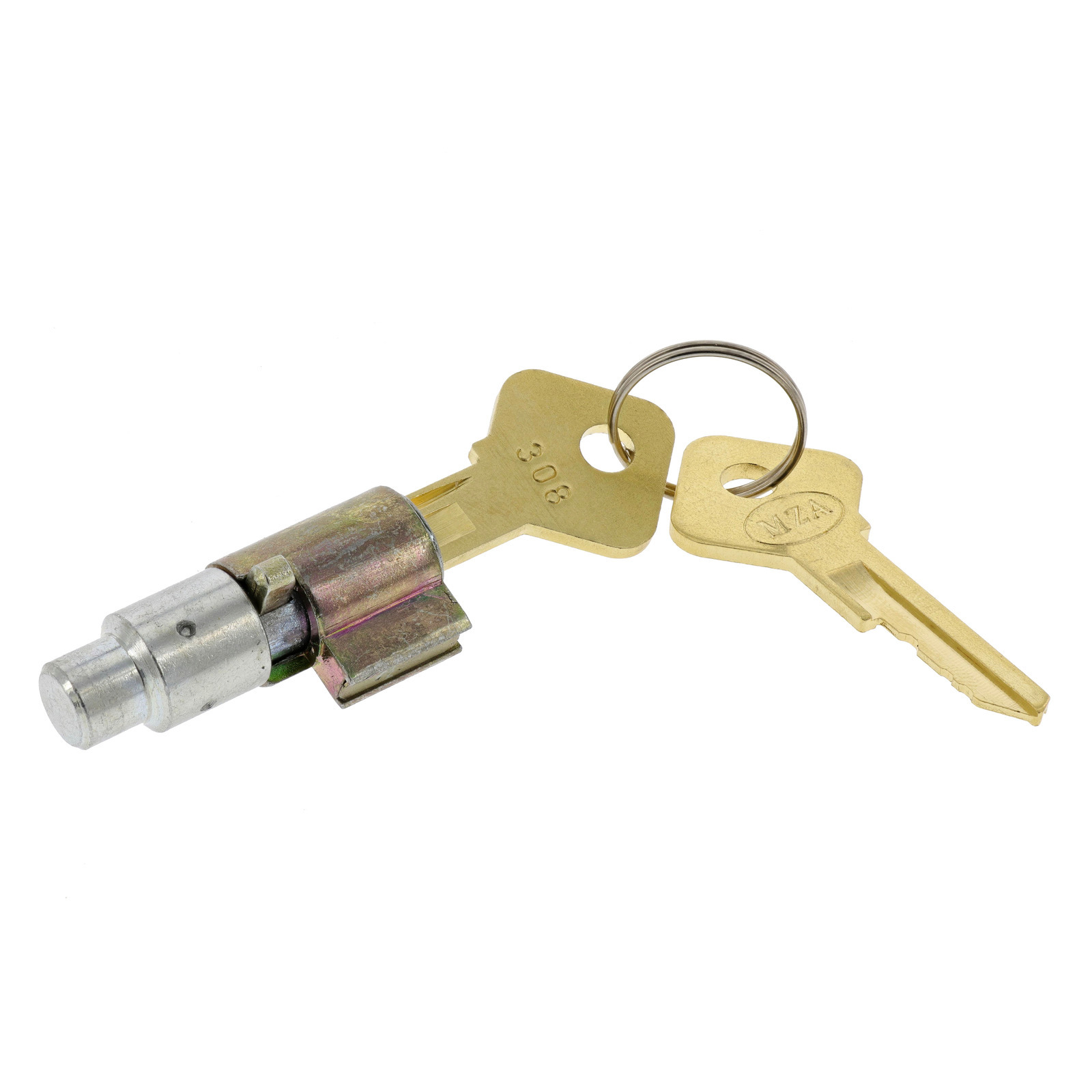 Sitzbankschloss. Komplett mit 2 Schlüsseln. Gesamtlänge 38mm. Durchmesser Ø13mm. Sperrbolzen vorn Ø9mm. Passend für die MZ Motorräder Sitzbankschloss, MZ ES125, ES150, ES175, ES250. MZA-Nummer: 15037