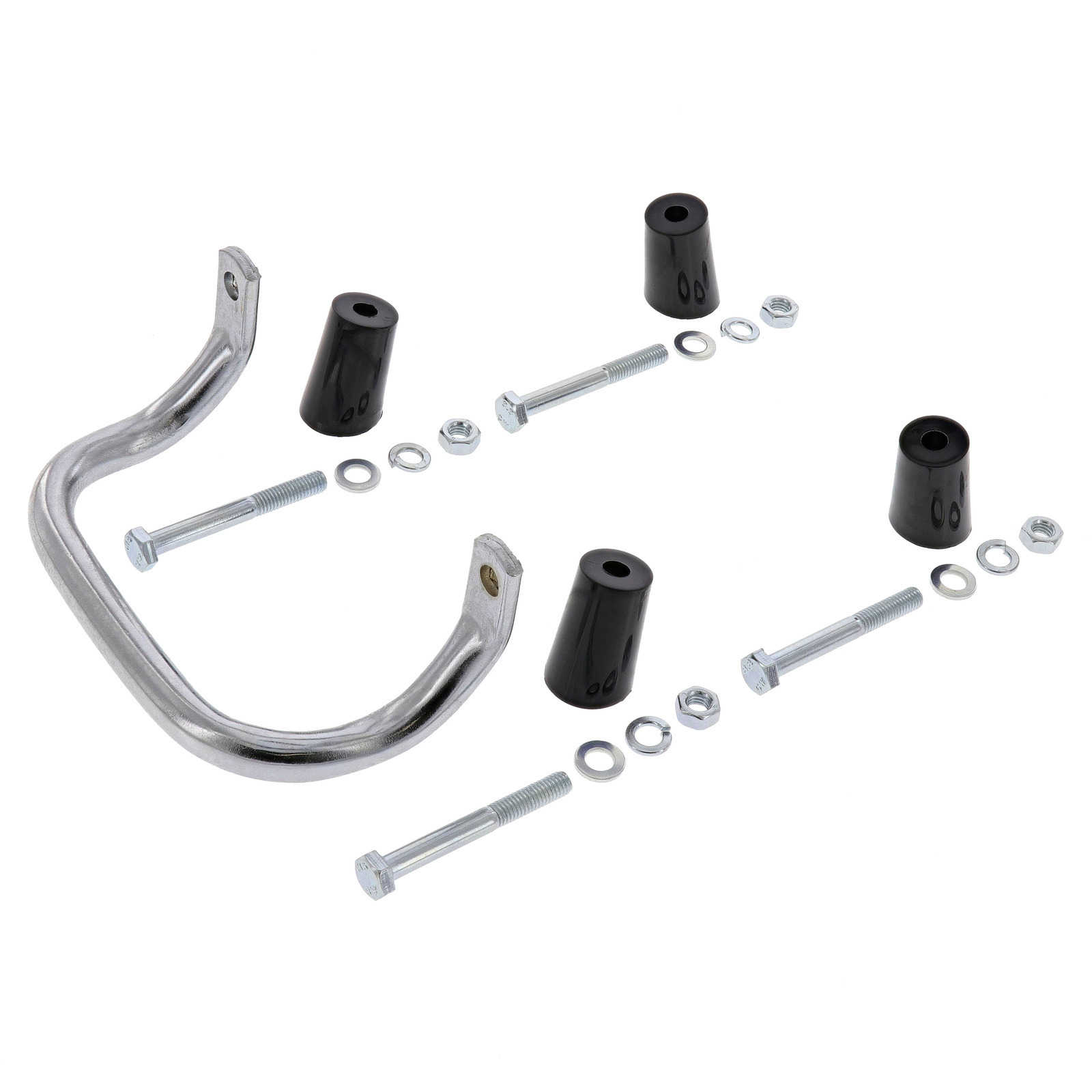 Beinhaltet die Schrauben in der richtigen Länge und Muttern, Distanzstücke schwarz und den Aufbockgriff.
