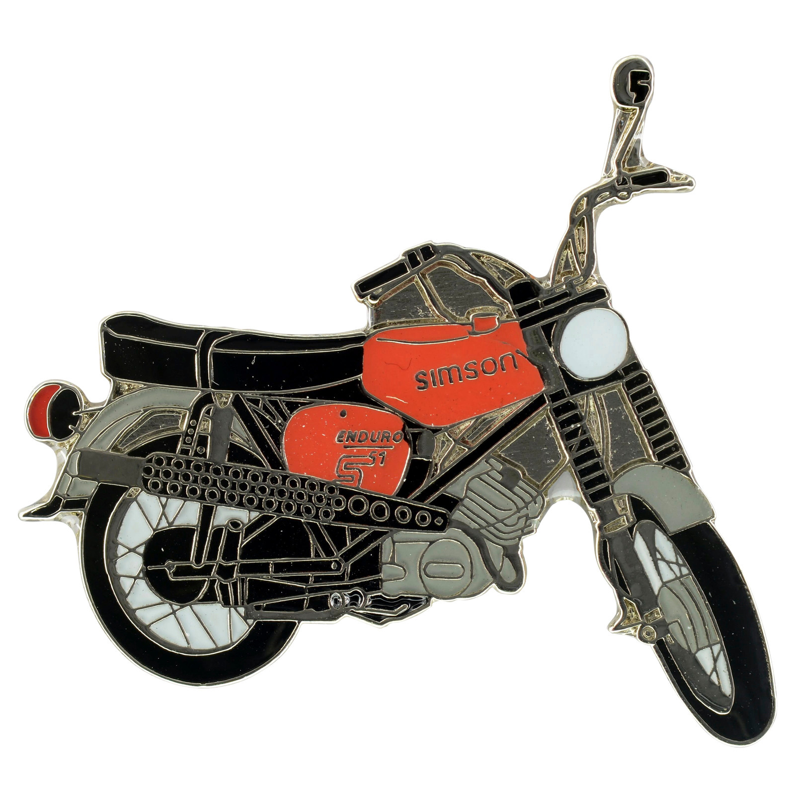 Anstecker (Metall-PIN). Abbildung Simson S51, S70 Enduro (Rot). Ca. 38mm breit und 36mm hoch. Mehrfarbig. Rückseitig 2 Schmetterlings-Verschlüsse.