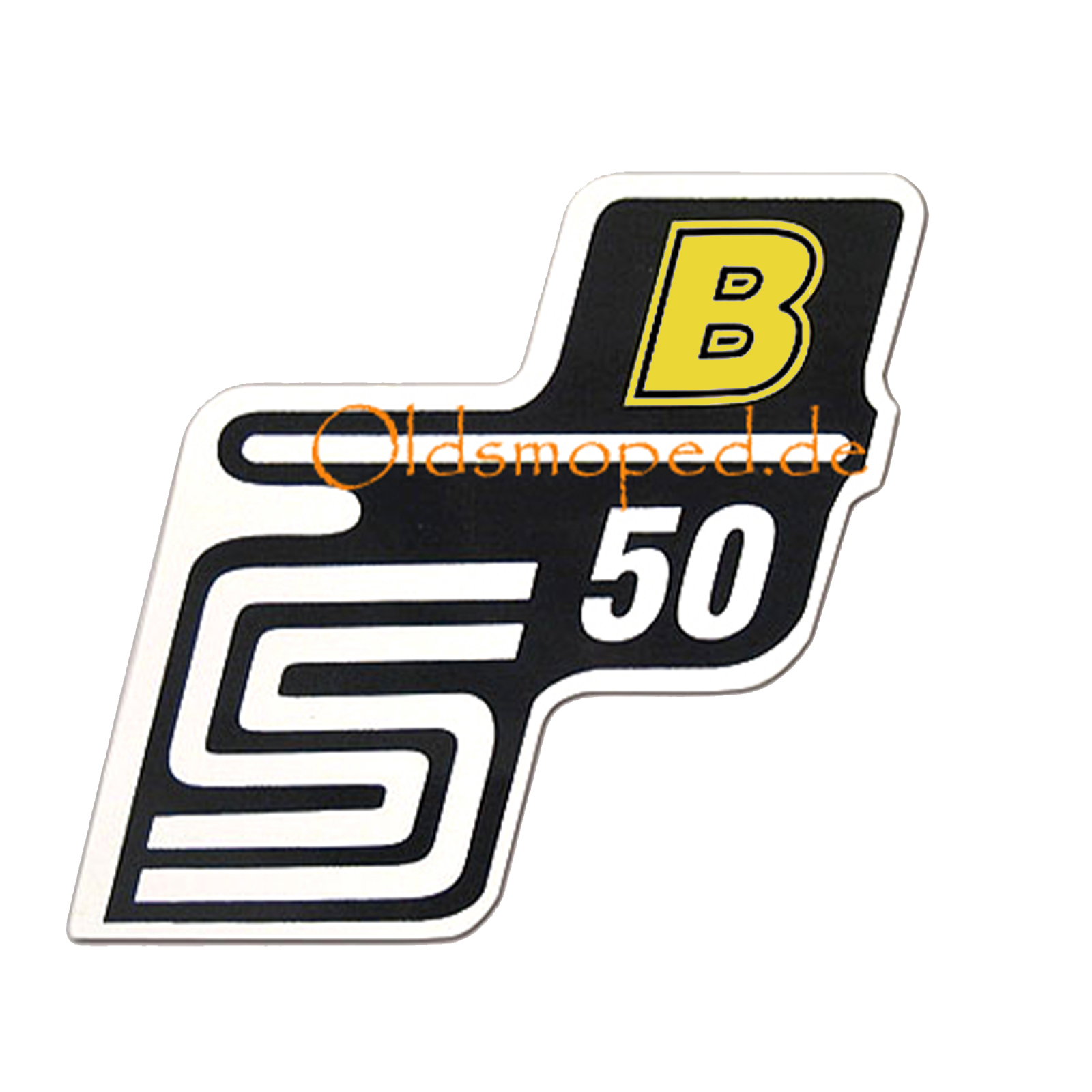 Aufkleber für den Seitendeckel. Klebefolie. Schriftzug "S50 B". Die Farbe der Ausführung ist gelb. Passend für das Simson Moped vom Typ S50.