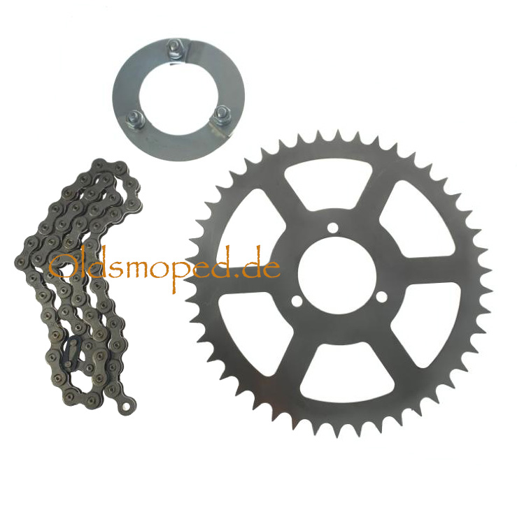 Bestehend aus Kettenrad (Edelstahl) mit 46 Zähnen, Kette, 3-teiliges Halteblech (Edelstahl), 3x Sechskantschraube M6, 3x Unterlegscheibe 6,4 und 3x Sechskantmutter M6.