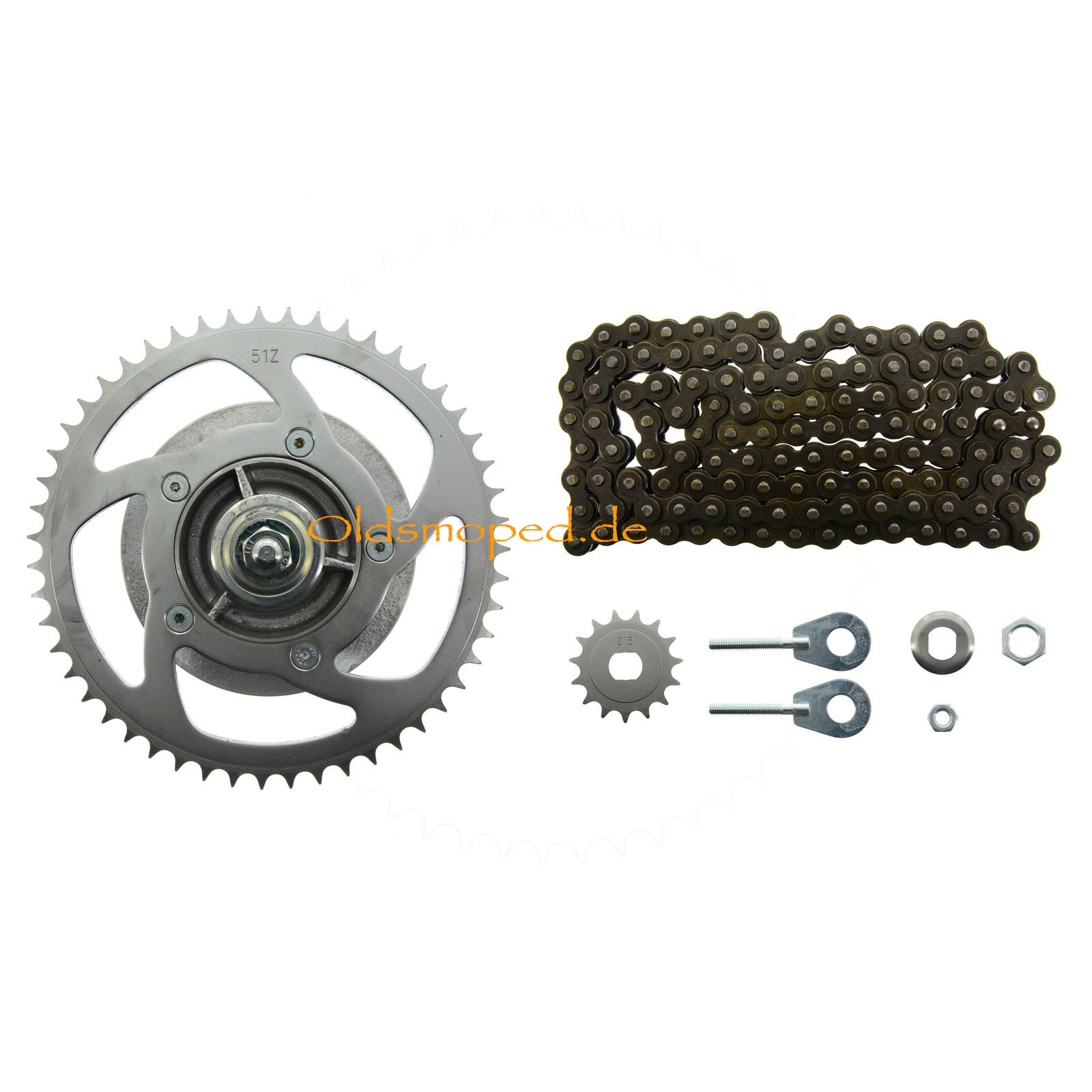 Rollenkette 118 Glieder und Antriebskettenrad Z=13. Sehr kurze Übersetzung.