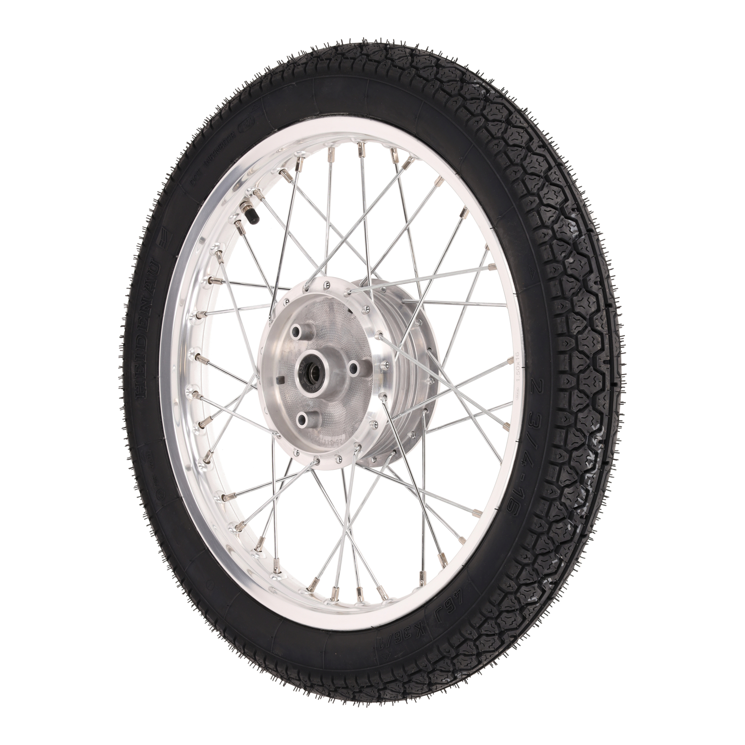 Felge aus poliertem Aluminium. Chromspeichen. Grauguß-Bremsring für bessere Bremswirkung.