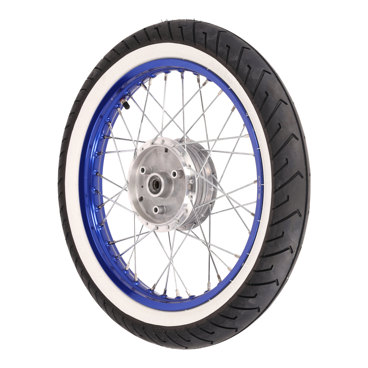 Komplettrad, Alufelge blau (vorn) 1,50x16 mit Weißwandreifen, Simson S50, S51, S70, KR51, SR4-2, SR4-4