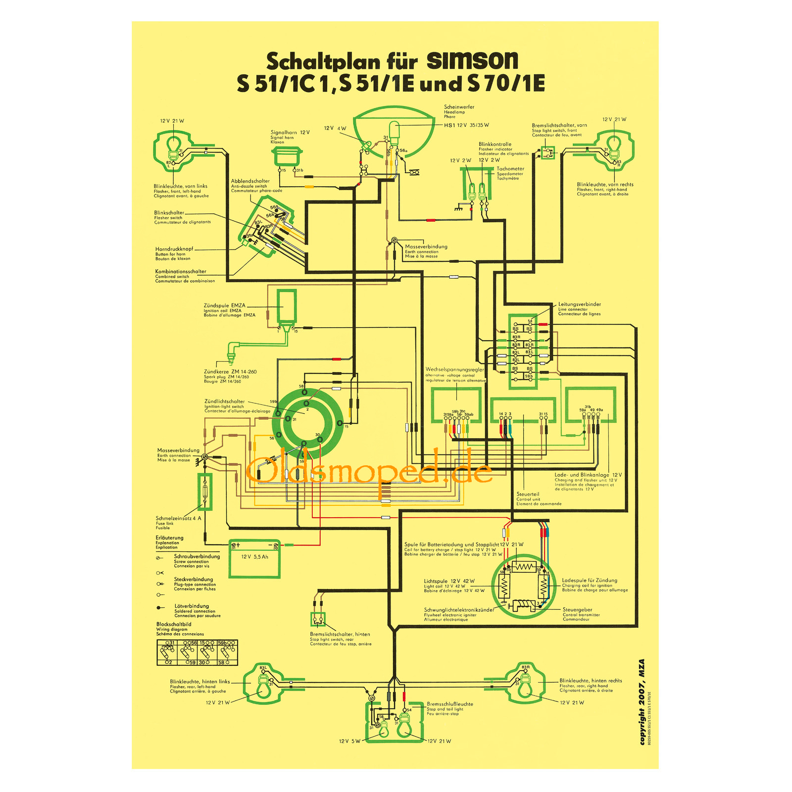 Schaltplan als großes Farbposter (40x57cm). Der Artikel ist beidseitig Glanzcello beschichtet und schmutzabweisend. Passend für das Simson Moped vom Typ S51/1 C1, S51/1 E und S70/1 E. Ideal für die Werkstatt oder den Hobbyraum.