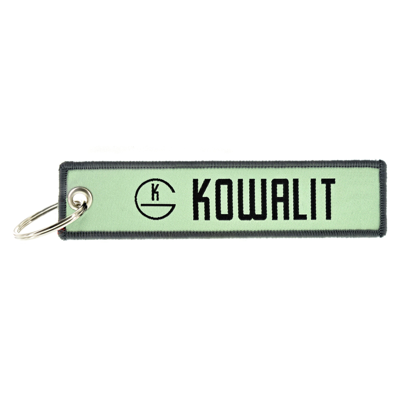 Stoff-Schlüsselanhänger. Motiv: KOWALIT. 2-farbig. Rückseitiger Schriftzug: Wenn´s Gummi sein soll. Gesamtlänge ca. 13cm. Höhe 3cm. Mit Schlüsselring.