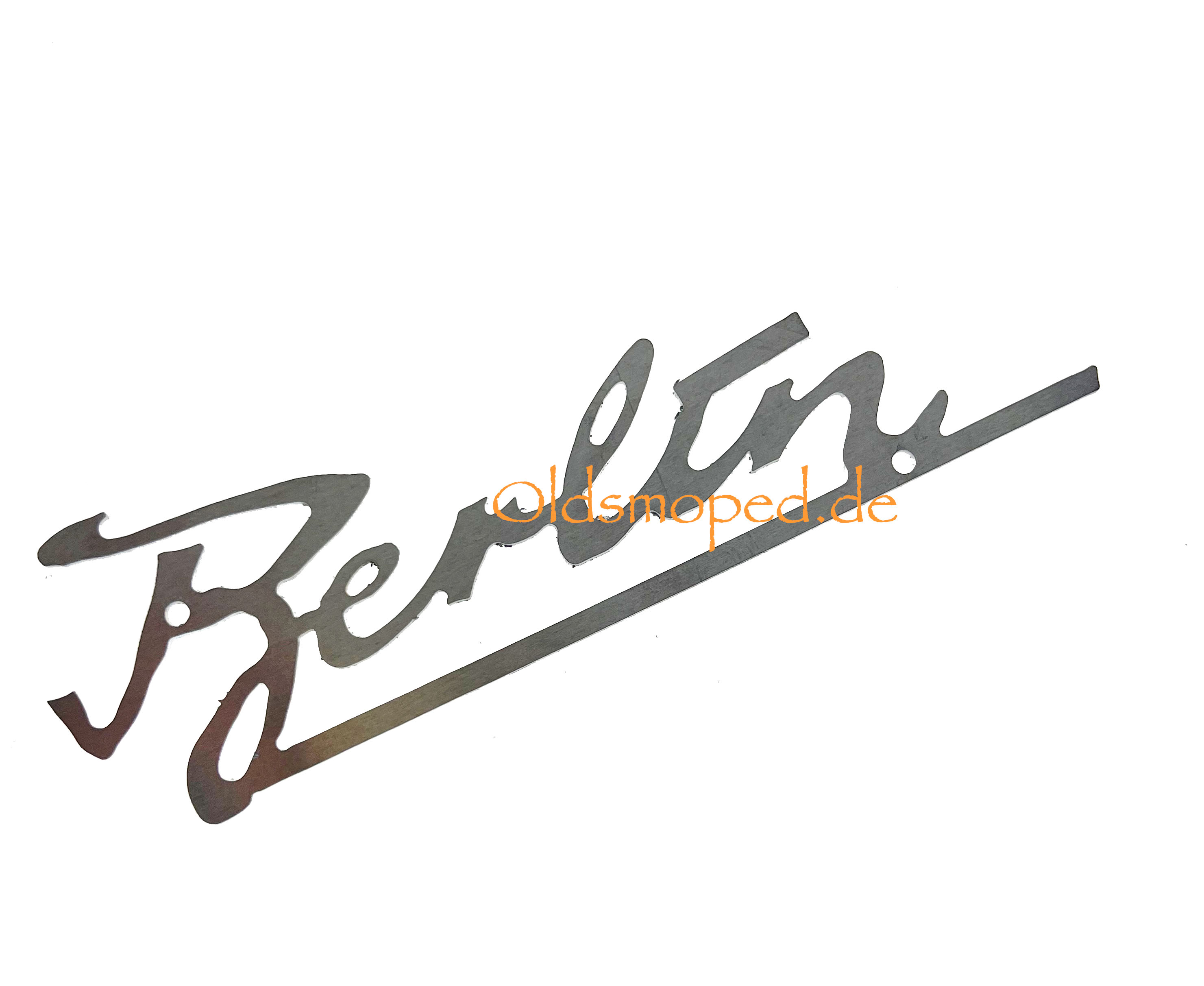 Plakette Schriftzug "Berlin". Das Material ist Aluminium. Für den IWL Roller SR59. Die Ersatzteilnummer ist 01-822.292-1. 2. Wahl. Schlechte Verarbeitung.
