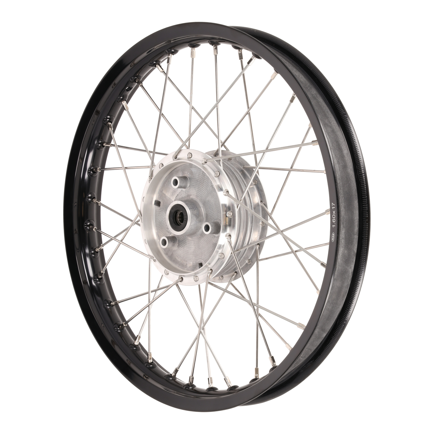 Speichenrad, 1,6x17 Zoll (Hinterrad). Alufelge schwarz eloxiert mit Edelstahlspeichen.