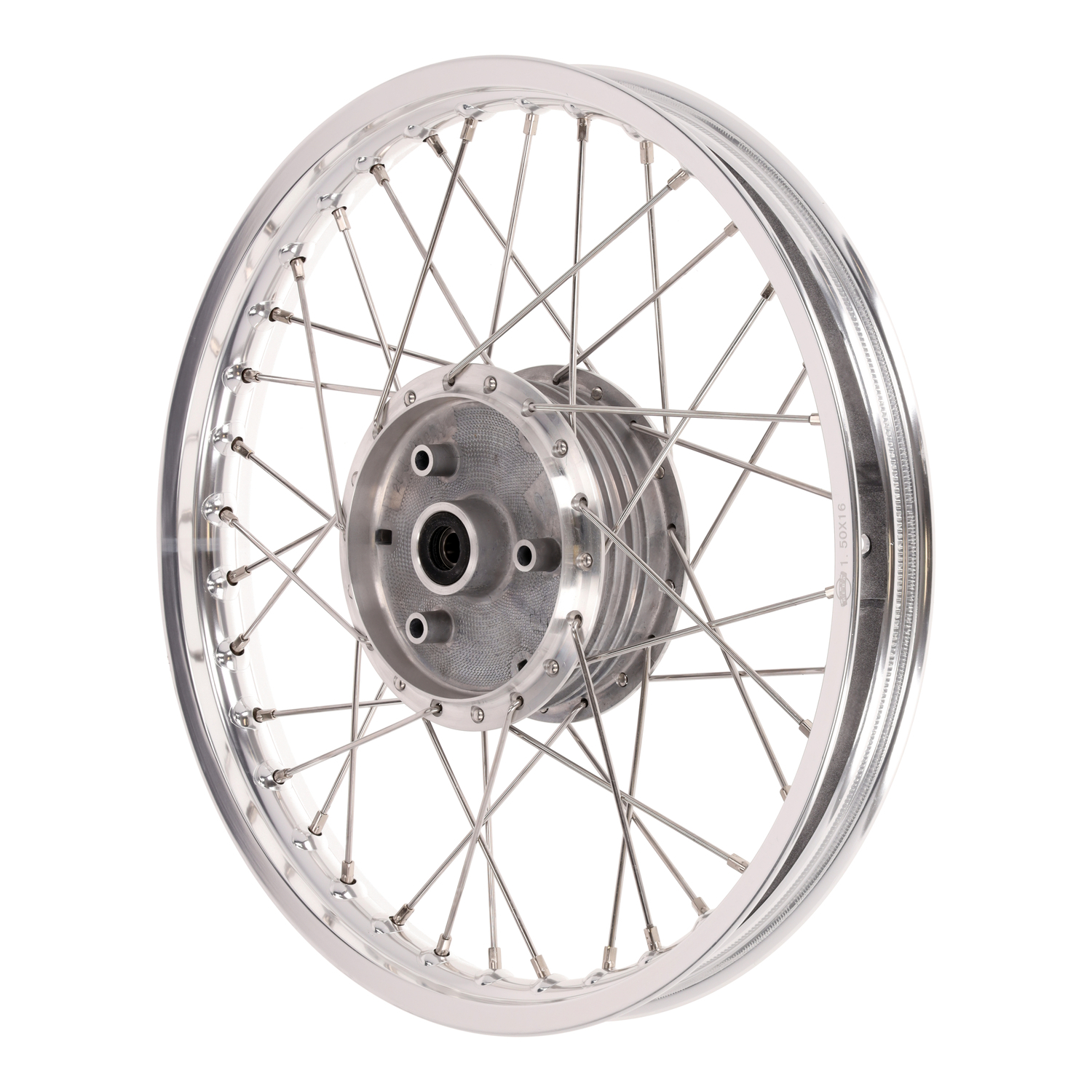 Speichenrad, Standard Ausführung 1,5x16 Zoll. Die Felge ist aus poliertem Aluminium.
