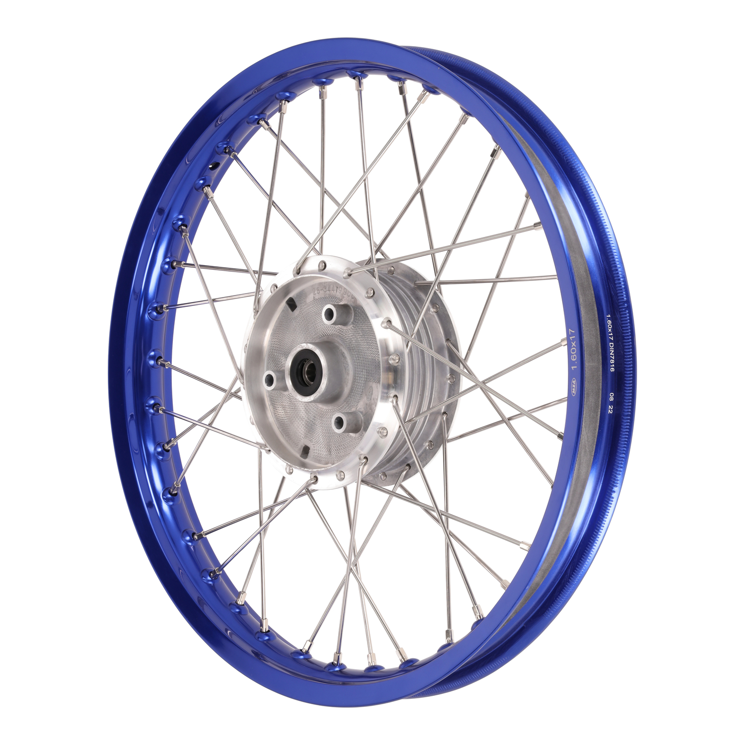 Speichenrad, 1,6x17 Zoll (Hinterrad). Alufelge blau eloxiert mit Edelstahlspeichen.