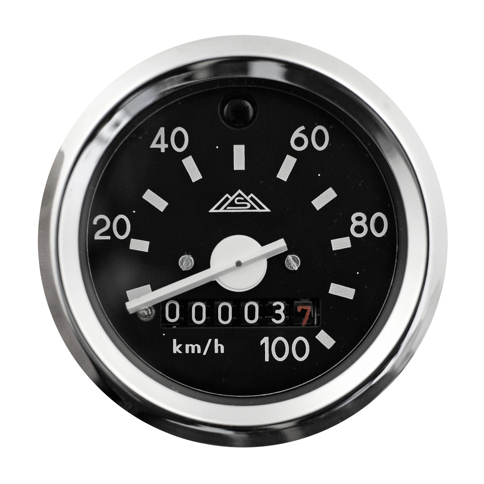 Komplett mit Chromring Ø60mm. Das Ziffernblatt ist bis 100kmh ausgelegt.