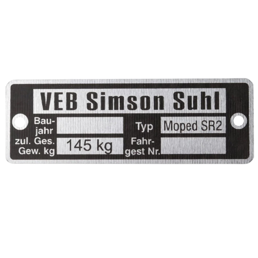 Typenschild. Ohne Bohrungen. Auch als Rahmenplakette bezeichnet. Diese Variante sitzt am Rahmen unter dem Federkasten. Passend für Simson SR2.
