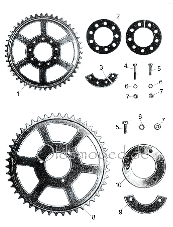 Fig 1: großes Kettenrad (1330-O-Z) Fig 2: Gummischeibe (1331-O-Z) Fig 3: Segmente (1332-O-Z) Fig 4: Zylinderschrauben M6x25 (1004-O-M) Fig 5: Sechskantschrauben M6x30 (1333-O-Z) Fig 6: Zahnscheiben 6,4 (1006-O-M) Fig 7: Sechskantmuttern M6 (1334-O-Z) Fig 8: großes Kettenrad (1330-1-Z) Fig 9: Segmente (1332-1-Z) Fig 10: Scheibe (1335-O-Z) Artikel nur zur optischen Darstellung der Exlosionszeichnung - nicht bestellbar!