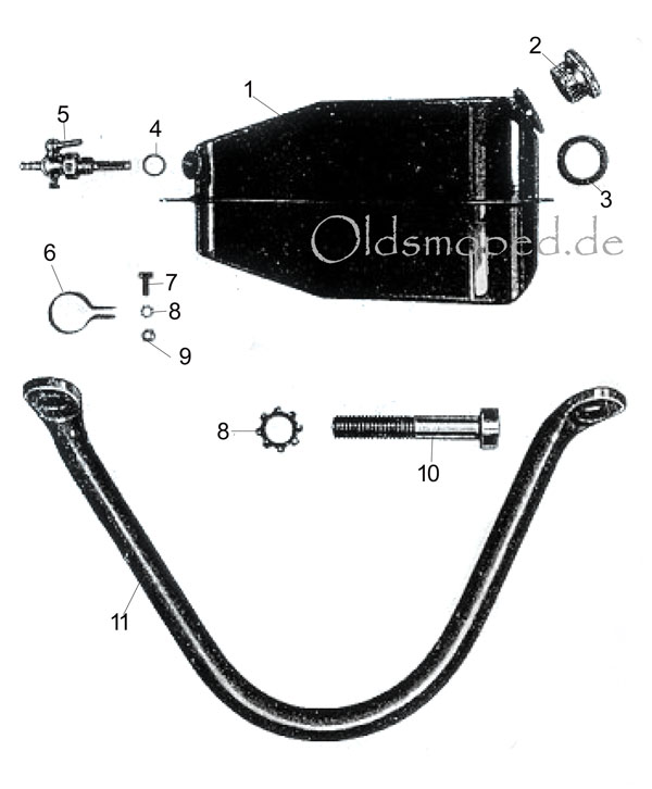 Fig1: Kraftstofftank (1340-O-Z) Fig 2: Verschlußkappe (1341-O-Z) Fig 3: Dichtung (1342-O-Z) Fig 4: Dichtung 14x18 (1343-O-Z) Fig 5: Kraftstoffhahn (1344-O-Z) Fig 6: Schelle (1345-O-Z) Fig 7: Sechskantschraube M6x18 (1346-O-Z) Fig 8: Zahnscheiben 6,4 (1006-O-M) Fig 9: Sechskantmutter M6 (1347-O-Z) Fig 10: Zylinderschraube M6x35 (1351-O-Z) Fig 11: Bügel (1350-O-Z) Artikel nur zur optischen Darstellung der Exlosionszeichnung - nicht bestellbar!